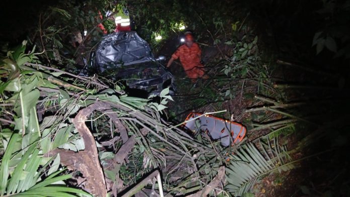De acordo com informações da Polícia Rodoviária Federal, um Renault Clio, que saiu da pista, colidiu com um pequeno poste e, em seguida, caiu em uma ribanceira, em meio a mata fechada.