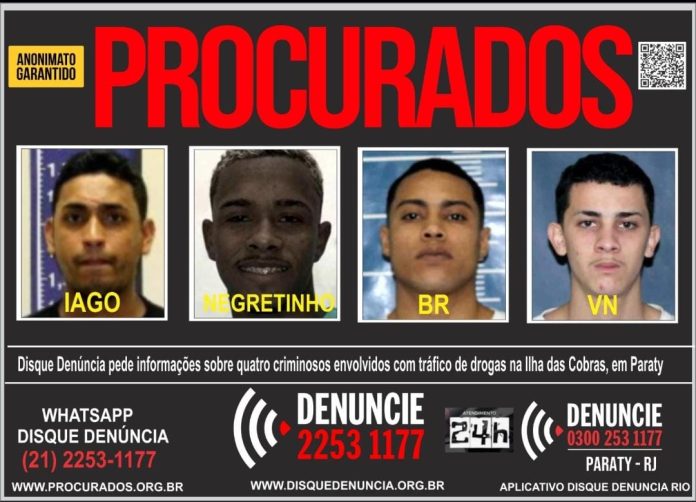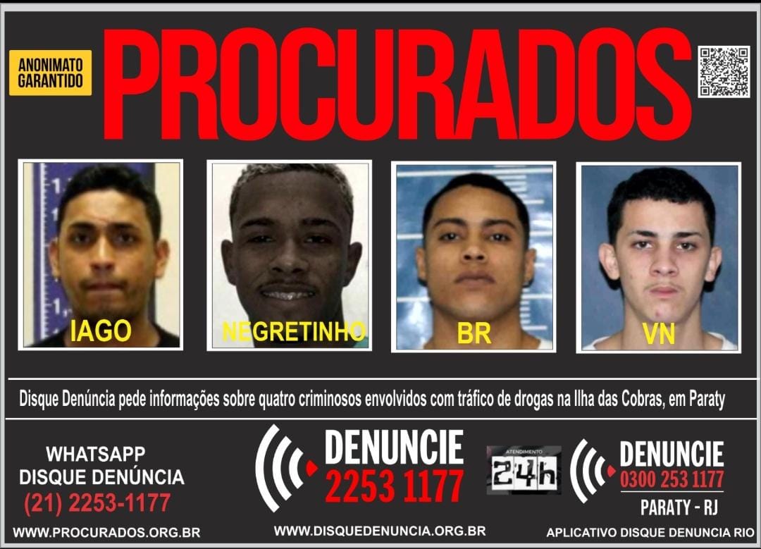 O Disque Denúncia divulgou um cartaz para auxiliar nas investigações da 2ª Companhia Independente de Polícia Militar/Paraty (2ª CIPM), pertencentes ao 5ª Comando de Policiamento de Área (CPA), a fim de obter informações que levem à localização e prisão de quatro traficantes, membros da Organização Narcoterrorista Comando Vermelho (CV), que vem atuando na Ilha das Cobras, em Paraty. São eles: Iago Santos da Silva, de 29 anos; Nathan Conceição Martins, vulgo “Negretinho”, de 24; Bruno Henrique Souza Torres, vulgo “BR”, de 25; e Vinicius Araújo Gomes, vulgo “VN”, de 24. Todos são considerados foragidos da Justiça.