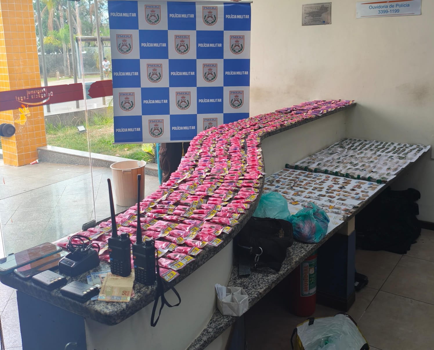 Na ação, os policiais apreenderam 708 gramas de maconha, 477 gramas de cocaína, 33 gramas de crack, além de dois celulares, dois rádios comunicadores e R$ 65 em espécie.