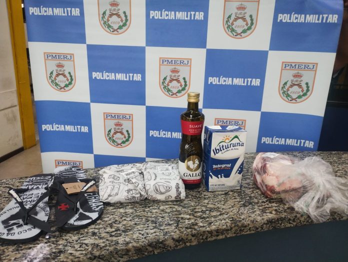 Segundo a polícia, a guarnição foi acionada pelo estabelecimento comercial, que informou que a suspeita havia sido surpreendida fora do supermercado com os produtos subtraídos. Entre os itens recuperados estavam carne, queijo mussarela, leite, azeite e um chinelo.