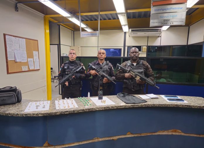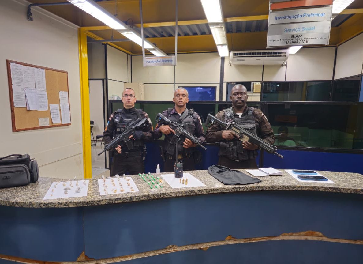 De acordo com a Polícia Militar, as equipes receberam denúncias de que três homens estariam vendendo drogas em um campinho da região. Ao chegar ao local, os agentes fizeram uma observação estratégica e confirmaram a movimentação suspeita. Segundo o registro, um dos envolvidos – um jovem de 20 anos – seria filho de um homem apontado como chefe do tráfico no bairro, já preso anteriormente.