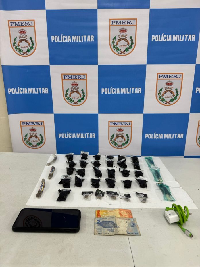 Segundo a PM, os agentes estavam finalizando outra ocorrência quando perceberam o rapaz em atitude suspeita. Ao ser abordado, ele teria tentado ignorar a ordem de parada, mas acabou sendo detido. Durante a revista, os policiais encontraram 28 pinos de cocaína, três sacolés de maconha, cinco porções de skank, um celular e R$ 22 em dinheiro.