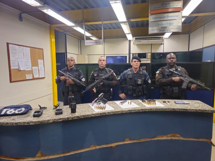 Na sequência, os policiais abordaram outros envolvidos e apreenderam uma pistola calibre 380 com numeração raspada, munições de diversos calibres, carregadores, rádios comunicadores, uma balança de precisão e uma adaga.