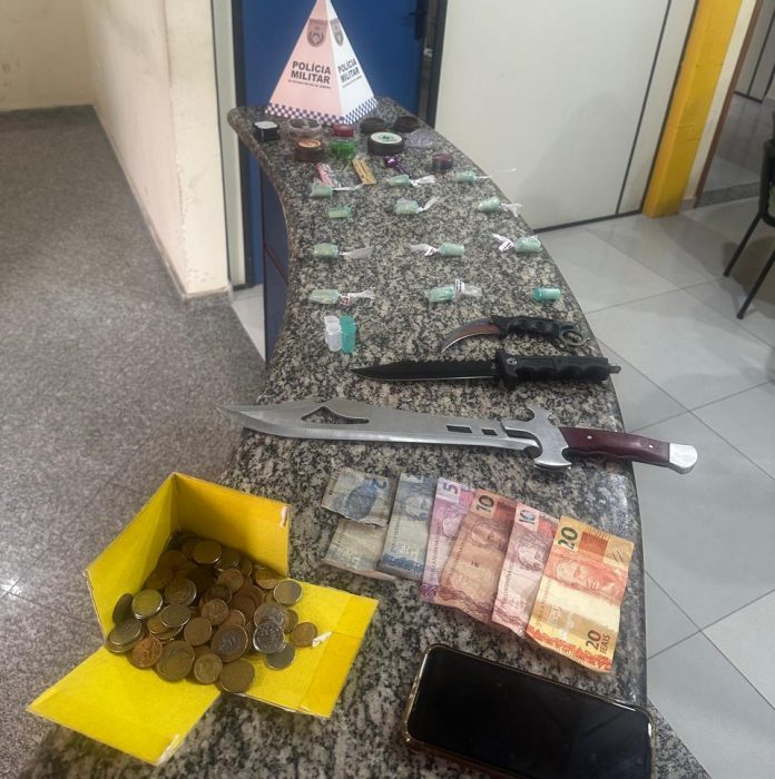 De acordo com o registro policial, os militares foram até o endereço e tiveram a entrada franqueada pelo proprietário do imóvel. Durante a revista, foram apreendidos 19 gramas de cocaína, R$ 68,20 em dinheiro, um celular e três facas.