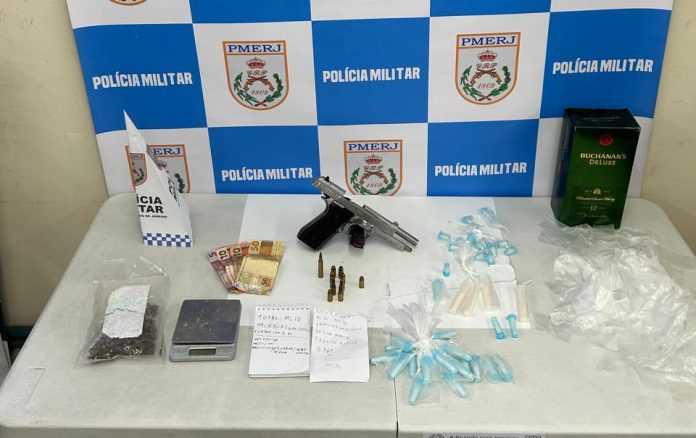 Questionado, o rapaz admitiu que havia drogas e uma arma dentro do imóvel e autorizou a entrada da equipe. No interior da residência, os policiais localizaram uma pistola Taurus calibre .380 com numeração suprimida, 11 munições, 37 pinos de cocaína (71,9g), um saco de maconha (51,6g), uma munição de fuzil, uma balança de precisão, anotações sobre o tráfico e um carregador.