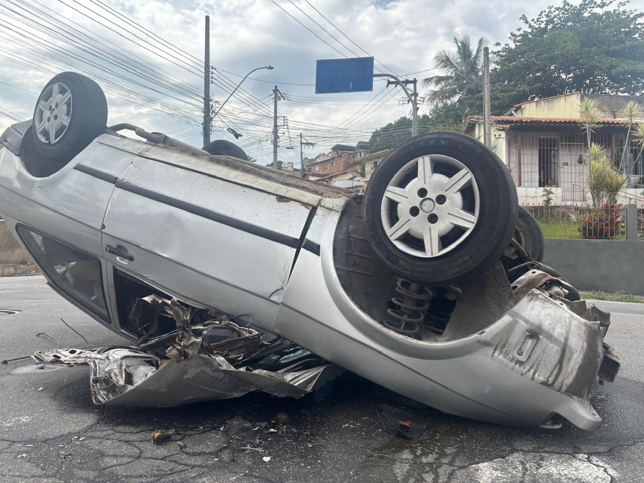 De acordo com as primeiras informações, um carro modelo Gol atingiu a traseira de um ônibus que realizava uma conversão. Com o impacto, o automóvel capotou e ficou com as rodas viradas para cima.