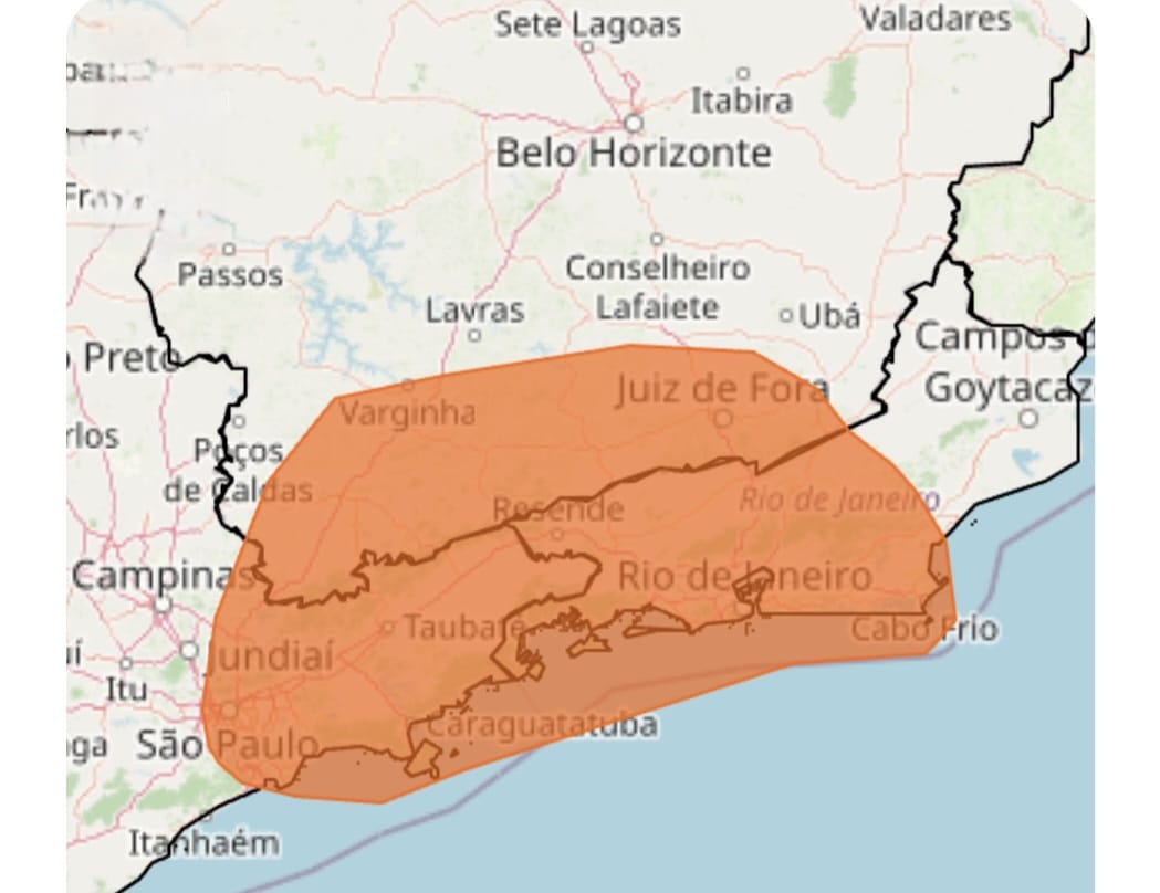 O alerta atinge cidades como Volta Redonda, Barra Mansa, Resende, Barra do Piraí, Pinheiral, Piraí, Porto Real, Quatis, Angra dos Reis e Paraty, entre outras.