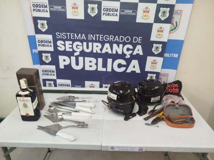 Em sequência, um dos agentes da GMVR iniciou buscas pelo segundo envolvido, o localizou e o deteve nas proximidades da linha férrea da BR-393, em posse de um pé de cabra, uma mochila e uma sacola contendo objetos furtados.
