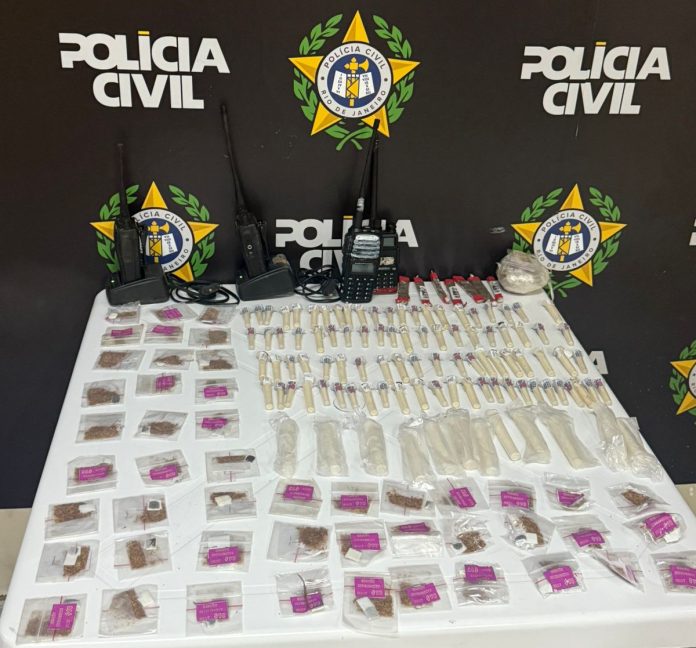 Com a dupla, a polícia apreendeu 97 pinos de cocaína, sete pequenos tabletes de maconha, 91 pedaços de haxixe, quatro rádios transmissores e dois celulares. Eles foram levados para a 90ª DP, onde acabaram autuados pelos artigos 33 e 35 da Lei de Drogas.