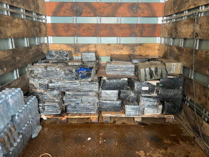 A Polícia Federal prendeu em flagrante nesta quinta-feira (dia 4) um caminhoneiro que transportava cerca de uma tonelada de maconha, oculta em meio a uma carga de água mineral. A abordagem ocorreu no município de Sapucaia. Durante a ação, policiais federais da Delegacia de Repressão a Drogas (DRE/RJ) inspecionaram o caminhão com o apoio de cães farejadores do CANIL/DRE, os quais identificaram a presença de entorpecentes ocultos atrás dos fardos de água.