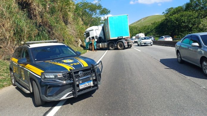 Carreta dá “L”, colide em barranco e agrava congestionamento na Dutra, em Barra Mansa