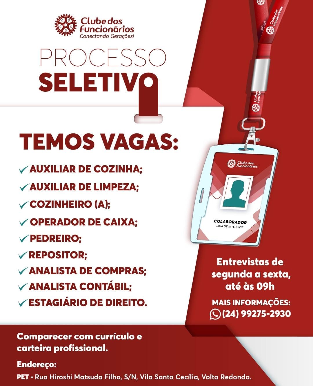 O Clube dos Funcionários, em Volta Redonda, está com processo seletivo aberto para preenchimento de vagas em diferentes áreas, contemplando funções operacionais, administrativas e estágio. A iniciativa amplia as oportunidades de emprego no município e é voltada a candidatos com diferentes níveis de escolaridade e experiência.