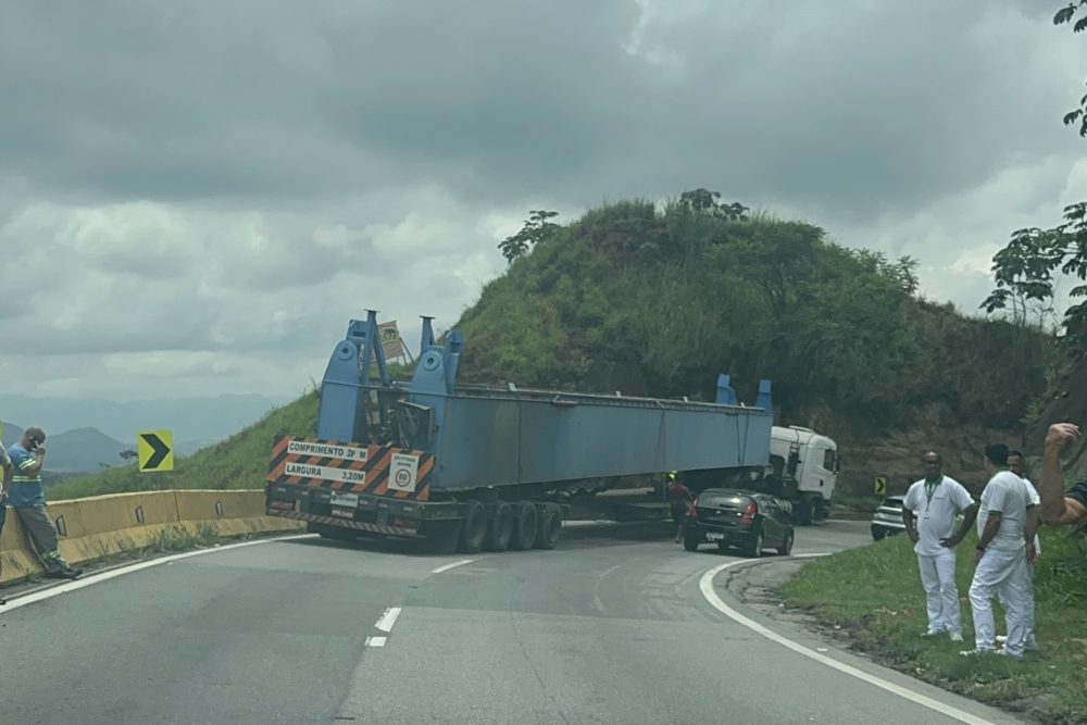 Segundo as informações apuradas, a retenção no tráfego teve início por volta das 10h e é causada por uma carreta que transporta uma viga de cerca de 30 metros de comprimento. O veículo enfrenta dificuldades operacionais para prosseguir a descida, o que comprometeu a fluidez no trecho.