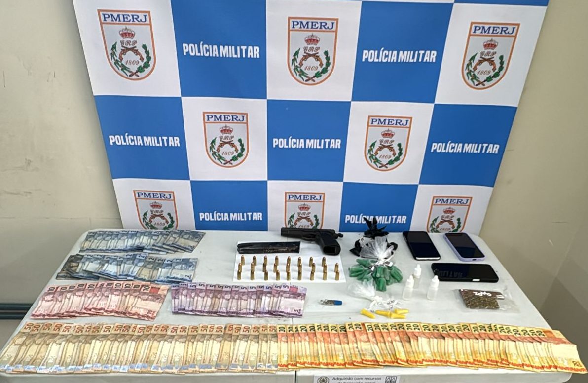 Na ação, os policiais apreenderam uma pistola Luger M95, um carregador de alta capacidade, 26 munições calibre 9mm, 40 pinos de cocaína, 11 porções de maconha, três frascos de substância conhecida como “loló” e R$ 2.360 em dinheiro. O caso foi encaminhado para a 93ª Delegacia de Polícia.