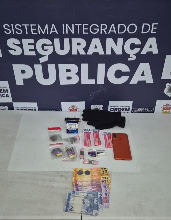 Entre os itens apreendidos estavam pinos de cocaína, porções de crack, maconha, além de R$ 90 em espécie, celular, isqueiro, um par de luvas e um maço de cigarros.