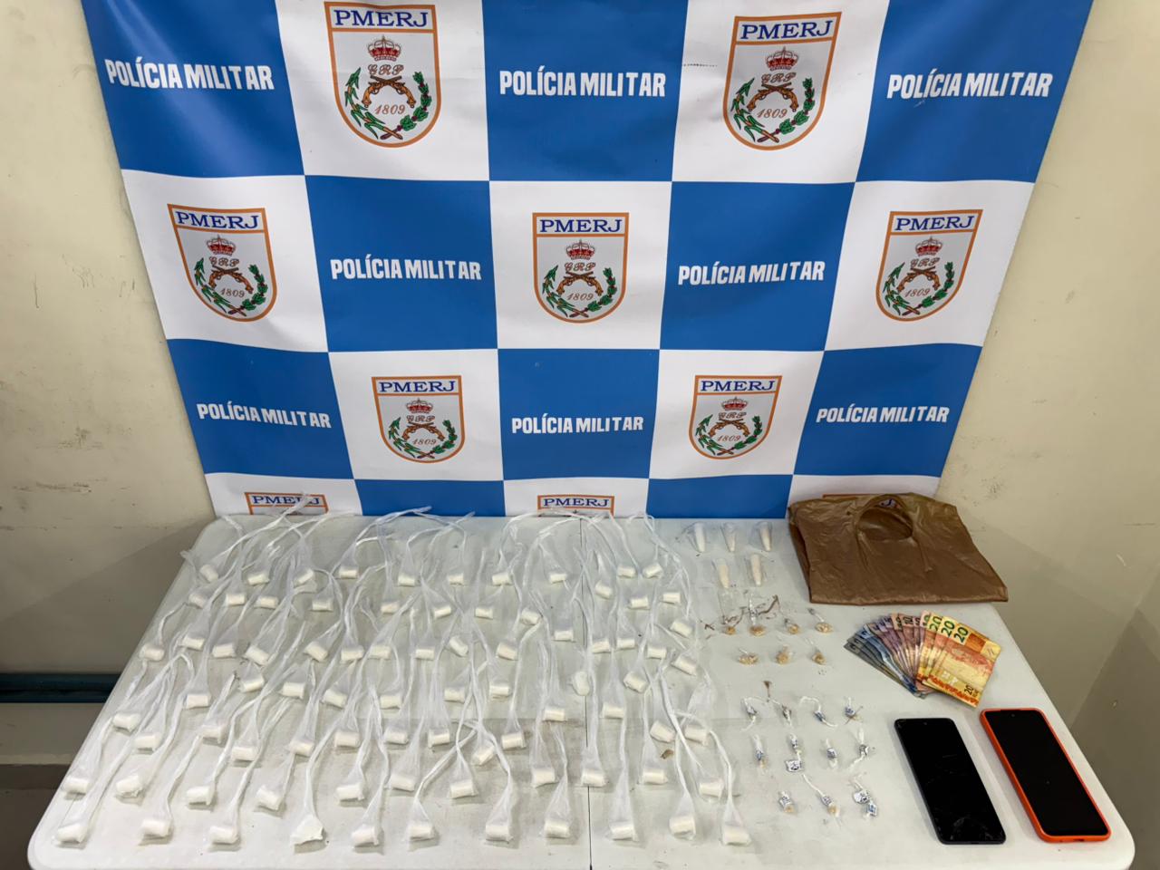 Ao todo, foram apreendidos 87 pinos de cocaína, que somaram cerca de 89 gramas, 18 pedras de crack, um aparelho celular e R$ 110 em dinheiro. O suspeito foi levado para a 93ª DP, onde a ocorrência foi registrada. Ele permaneceu preso e foi autuado por tráfico de drogas.