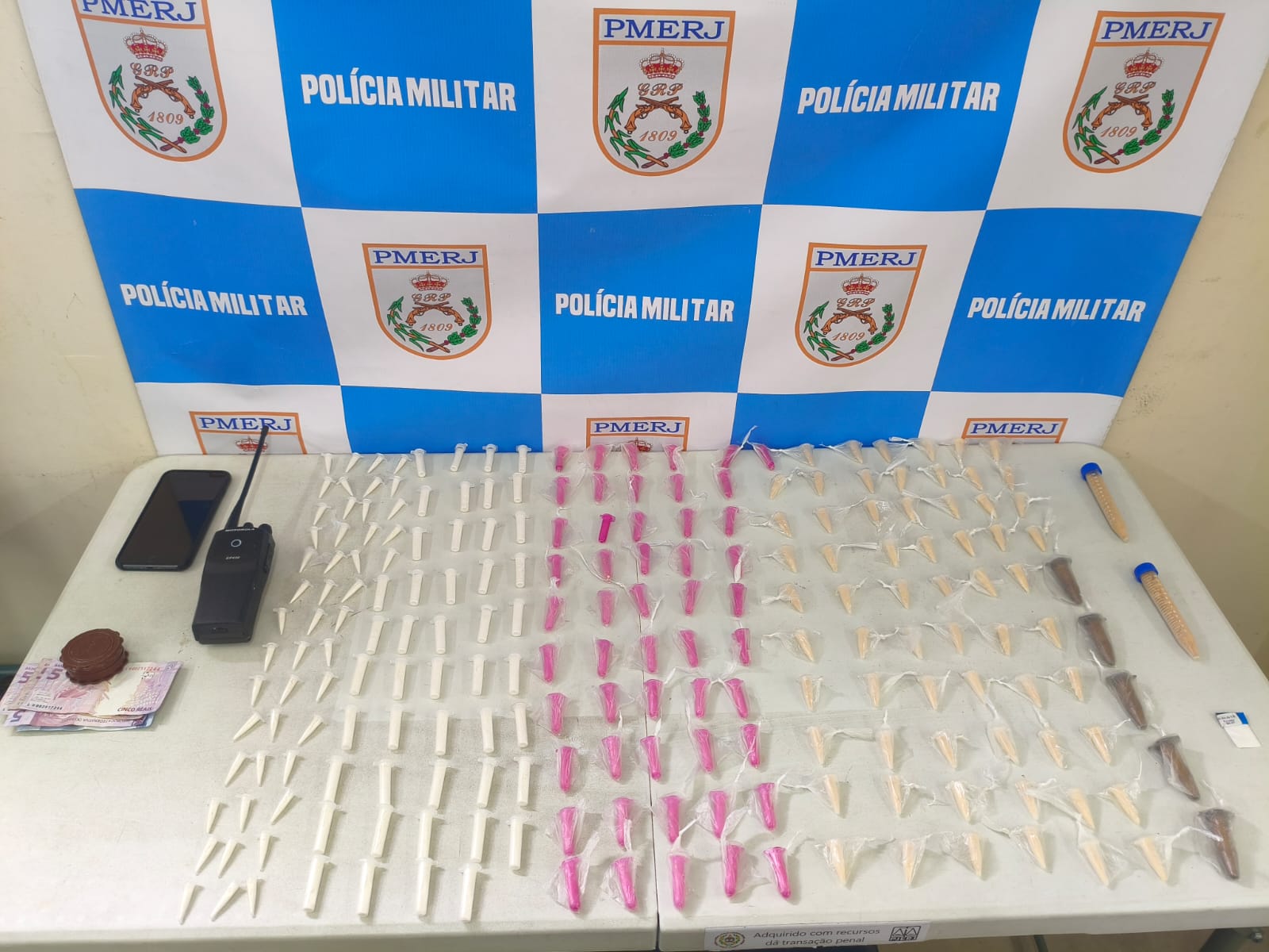 Com o suspeito, os agentes apreenderam entorpecentes – que ainda estão sendo contabilizados – além de um rádio transmissor, um aparelho celular e dinheiro em espécie. Todo o material foi encaminhado para a 93ª DP (Volta Redonda).