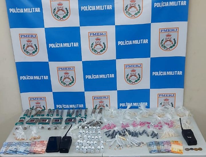 Entre o material recolhido estão 142 pinos de cocaína, 34 tiras de maconha, 13 pedras de crack, oito porções de haxixe, 34 frascos de loló, além de 13 cigarros, R$ 79 em dinheiro, um rádio transmissor e um telefone celular.