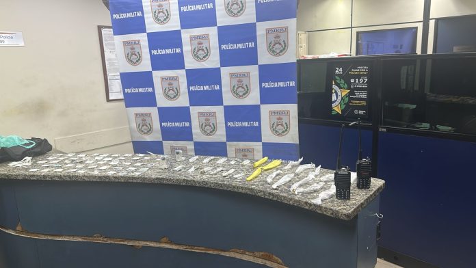 No local, foram apreendidas 48 pedras de crack, 24 trouxinhas de maconha, quatro porções de haxixe, dois frascos de loló e dois rádios transmissores, equipamentos normalmente usados para comunicação entre envolvidos no tráfico.