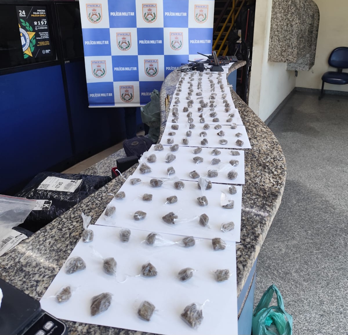 Foram apreendidas 134 trouxinhas de maconha, um pedaço adicional da mesma droga, um saco com pó suspeito, três balanças de precisão, um carregador de pistola calibre .380, uma munição calibre .38 intacta, quatro cartuchos do mesmo calibre, cinco rádios comunicadores, dois carregadores de rádio e oito sacos com pinos vazios normalmente utilizados para embalar drogas.