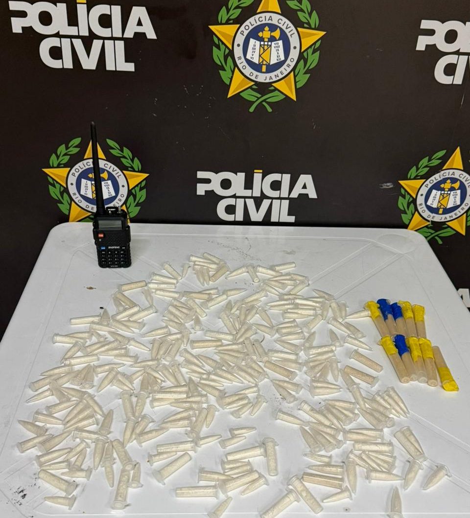 Foram apreendidos 262 pinos de cocaína e um rádio transmissor, utilizado para comunicação entre integrantes do tráfico.