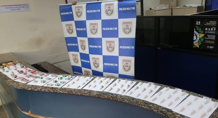 Durante a abordagem, foram apreendidos 53 pinos de cocaína, 32 trouxinhas de maconha, 12 frascos de loló e R$ 60 em dinheiro.