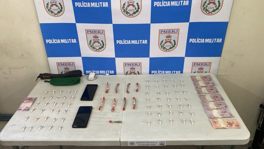 Ao todo, foram recolhidos cerca de 45 gramas de maconha e 33 gramas de cocaína, além de 65 pinos da droga, nove tiras de maconha, dinheiro em espécie e objetos como celulares e acessórios.