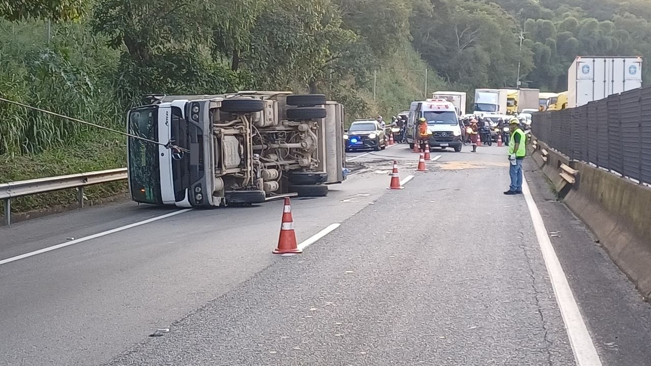 Caminhão de lixo tomba e interdita Dutra em Barra Mansa; estouro de um dos pneus pode ter causado o acidente